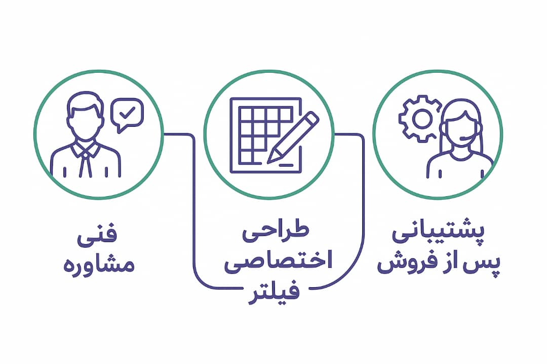 این شرکت خدماتی از جمله مشاوره فنی، طراحی اختصاصی فیلتر و پشتیبانی پس از فروش ارائه می‌دهد تا هر مشتری، دقیقاً محصولی متناسب با نیاز خود دریافت کند.